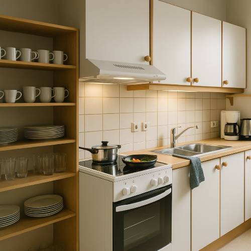 Hos os bestemmer I selv tempoet. I behøver ikke spise ude hver dag – for I har adgang til et lille fælleskøkken med komfur, køleskab og kaffemaskine. Her kan I lave en hurtig aftensmad, varme grød til de små eller bare nyde morgenkaffen i ro og mag.